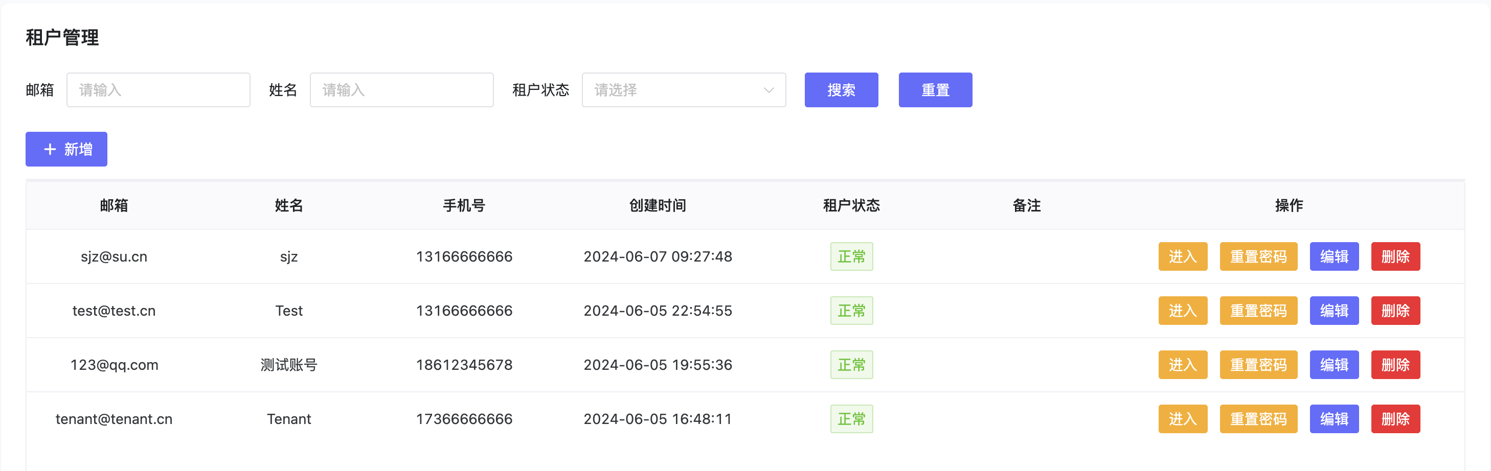 - Manage tenants in the system. Supports adding, editing, searching, deleting, resetting passwords, and entering the tenant administrator page, as shown below: