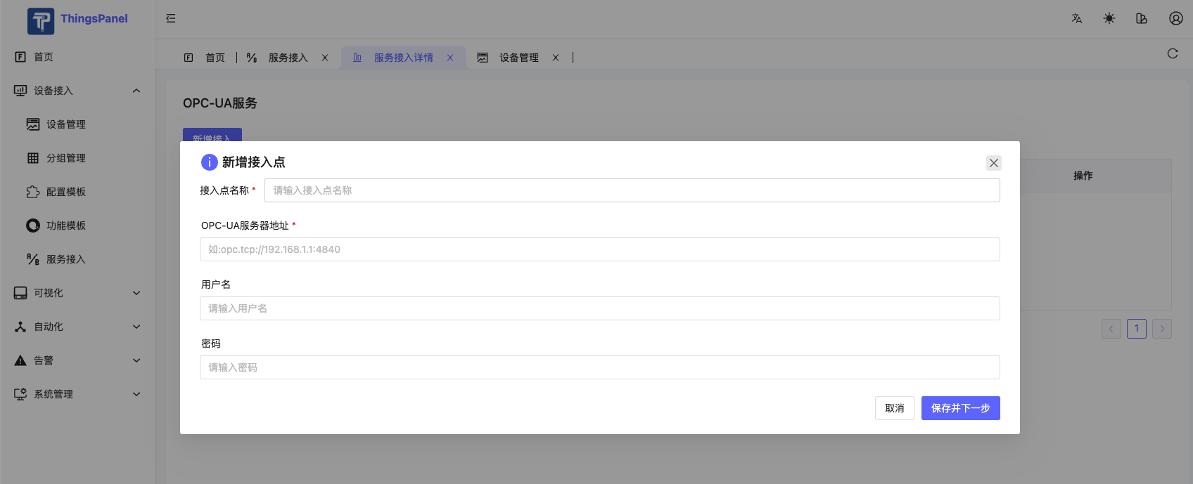 - 新增接入点,填入OPC-UA服务的地址等信息